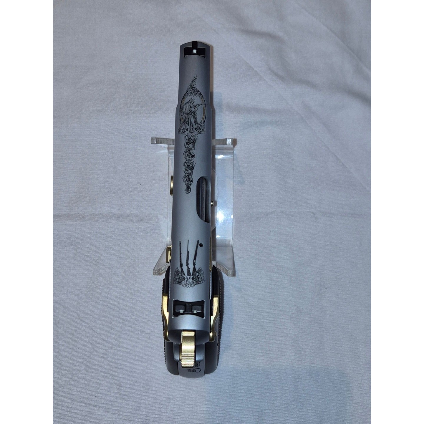Arme d’exception finition inox brossé mat,fines gravure et incrustation or