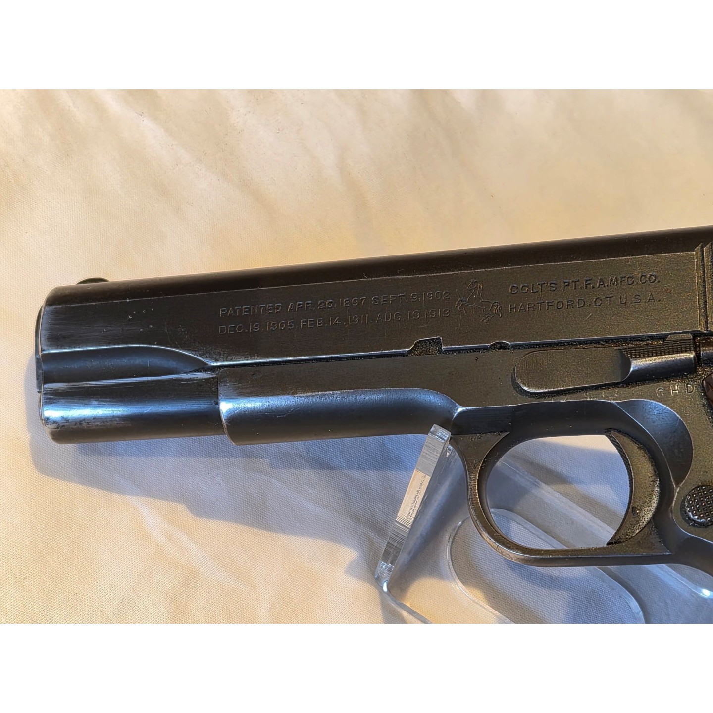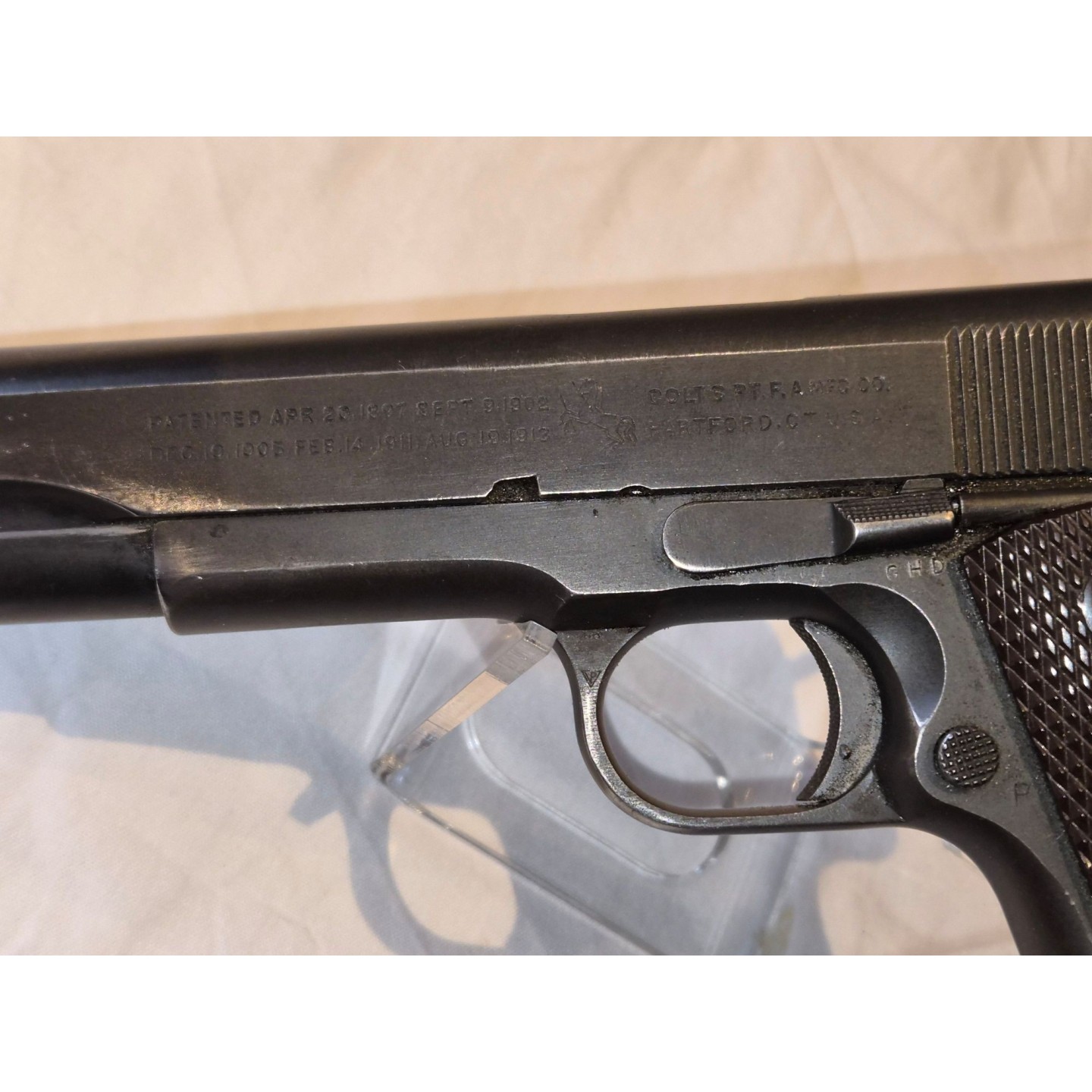 Pistolet Colt modèle 1911 A1 produit par Colt en 1943 pur seconde guerre sans remontage. Canon d'origine 45ACP à rayures d'aspect miroir sans usure ni tache. Phosphatage d'origine bien vert sans usure avec de superficielles taches marron sous la poignée sans aucune corrosion, avec de bons marquages non atténués.