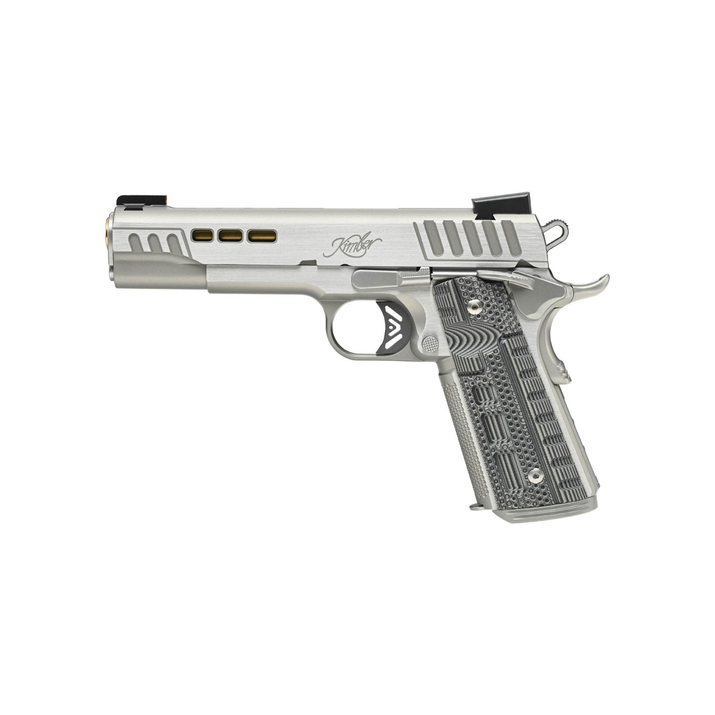 Les organes de visée Tru-Glo TFX Pro Day/Night, avec un anneau orange sur le guidon, garantissent une acquisition rapide et précise de la cible, quelles que soient les conditions d'éclairage. La carcasse et la glissière bénéficient d'une finition argentée KimPro II avec des faces polies, conférant au pistolet une allure élégante tout en assurant une protection contre la corrosion. Les plaquettes en G10 gris/noir, associées au pointillage Kimber Stiplex™ sur la sangle avant, offrent une adhérence optimale, même dans des conditions humides ou glissantes.