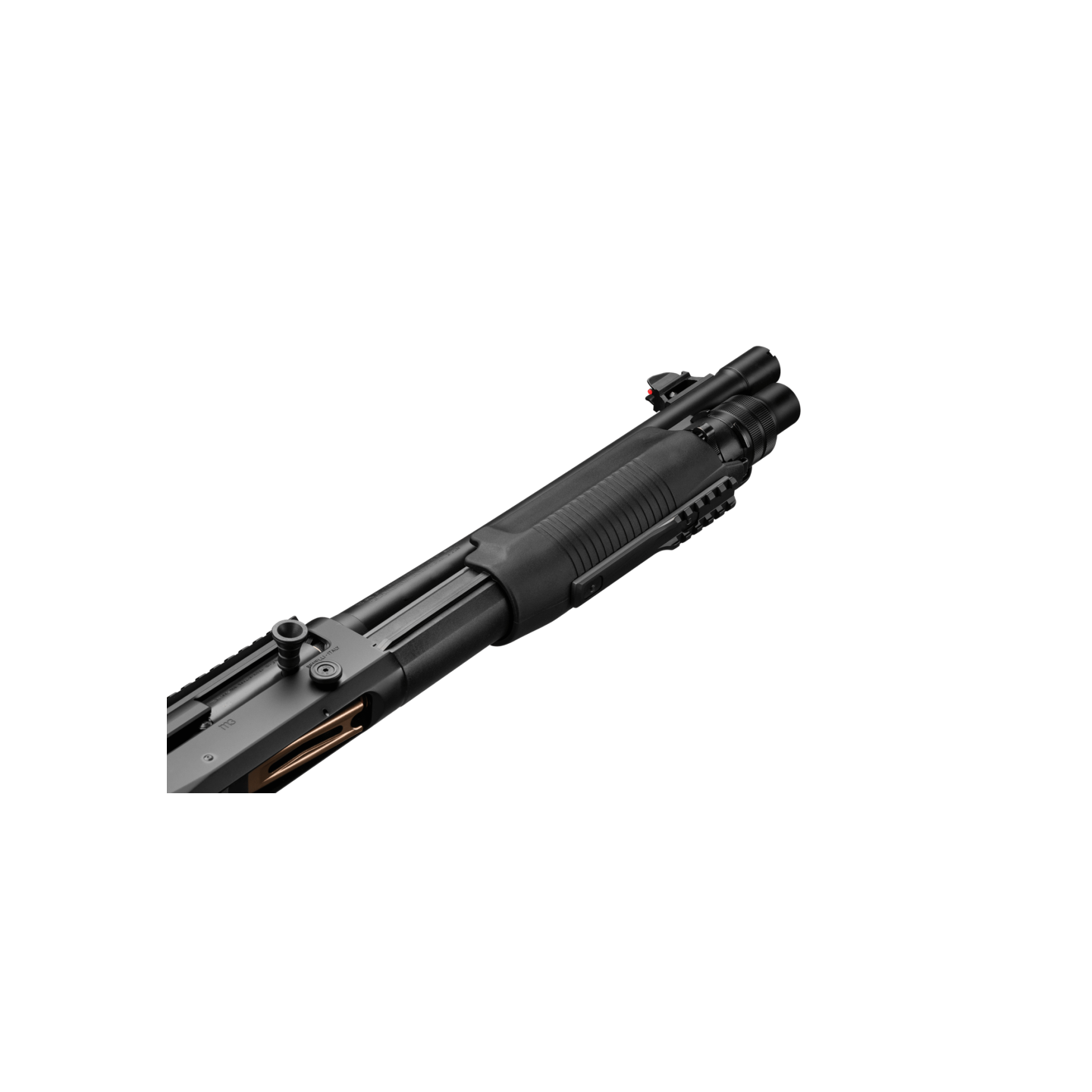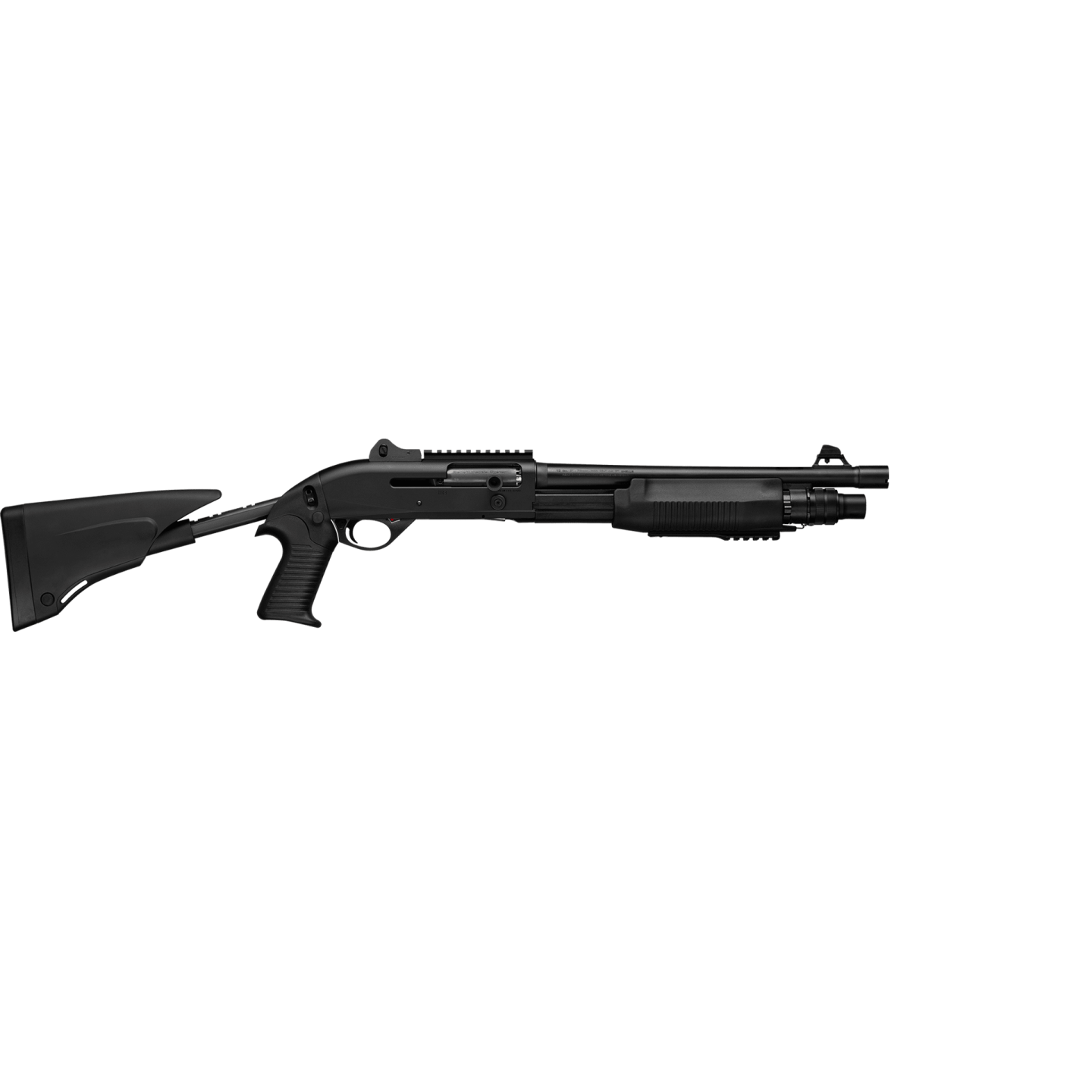 Fusil spécifique pour la défense personnelle qui offre l'avantage unique de l'action à pompe ou semi-automatique, sélectionnable de façon instinctive et rapide. Il est caractérisé par un système de visée Ghost Ring, avec hausse et guidon réglable, par la carcasse forée pour la fixation d'un rail, par la crosse avec porte-bretelle latéral et par la capacité maximum du magasin. Multi-rail.