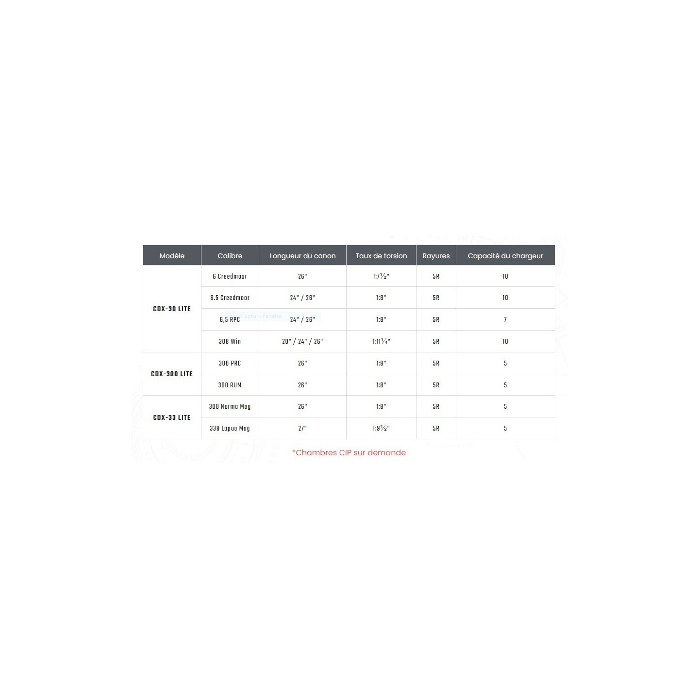 Disponible dans plusieurs calibres et plusieurs couleurs (pour toutes commandes, nous contacter pour plus d'informations/ voir tableau en photo/ fournie sans accessoires).