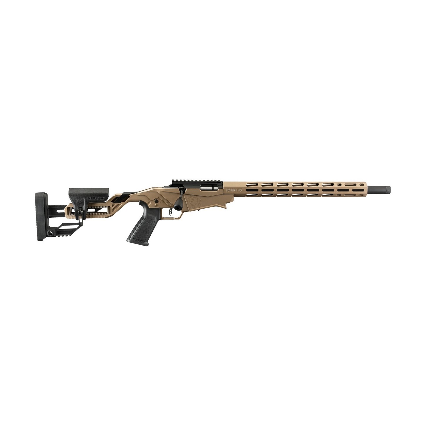 Modèle: PRECISION RIMFIRE Cal.22 lr Finition cerakote BURNT BRONZE Canon lourd de 46cm Pas de rayure 1:16" Filetage pour silencieux 1/2 X 28 Crosse et poignée type AR-15 Tactical noire ergonomique ultra légère, réglable en longueur et busc réglable . Rail de picatinny pour montage de lunette Levier de culasse surdimensionné Garde main allégé M-LOK MAGPUL