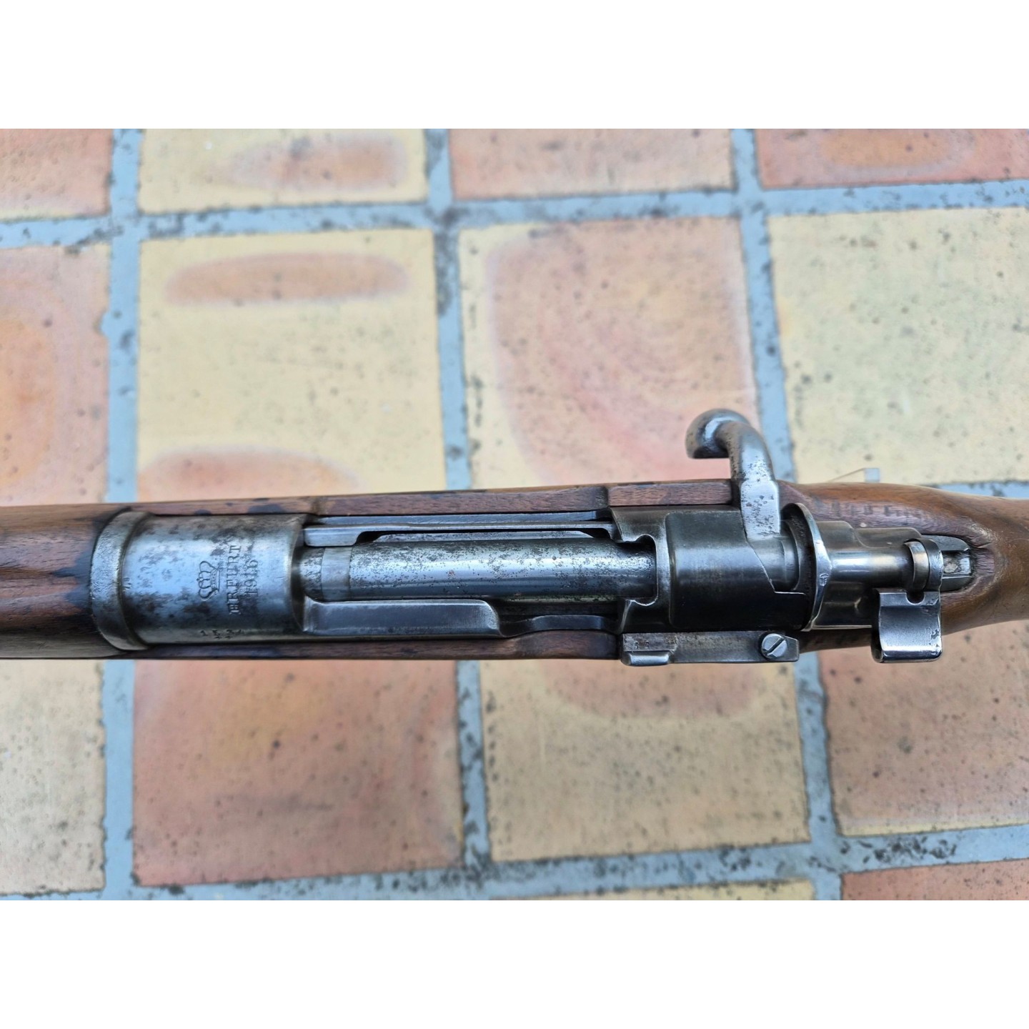 Carabine Mauser modèle 98A Erfurt 1916 calibre d'origine 8x57JS, capacité 5 coups à répétition manuelle. Bronzage d'origine patiné. Mécanisme complet et fonctionnel avec toutes pièces d'origine au même numéro sauf la culasse, marquages et poinçon non atténués. Canon miroir, rayures bien nettes, crosse et garde main en noyer bien réceptionné avec traces de manipulation.