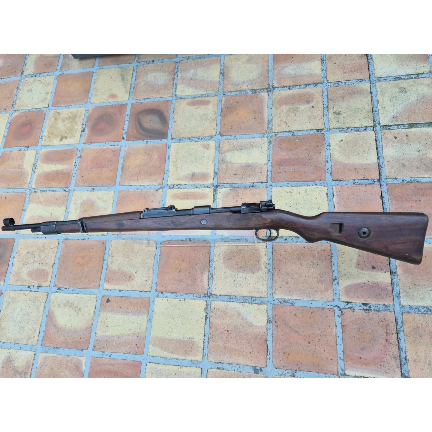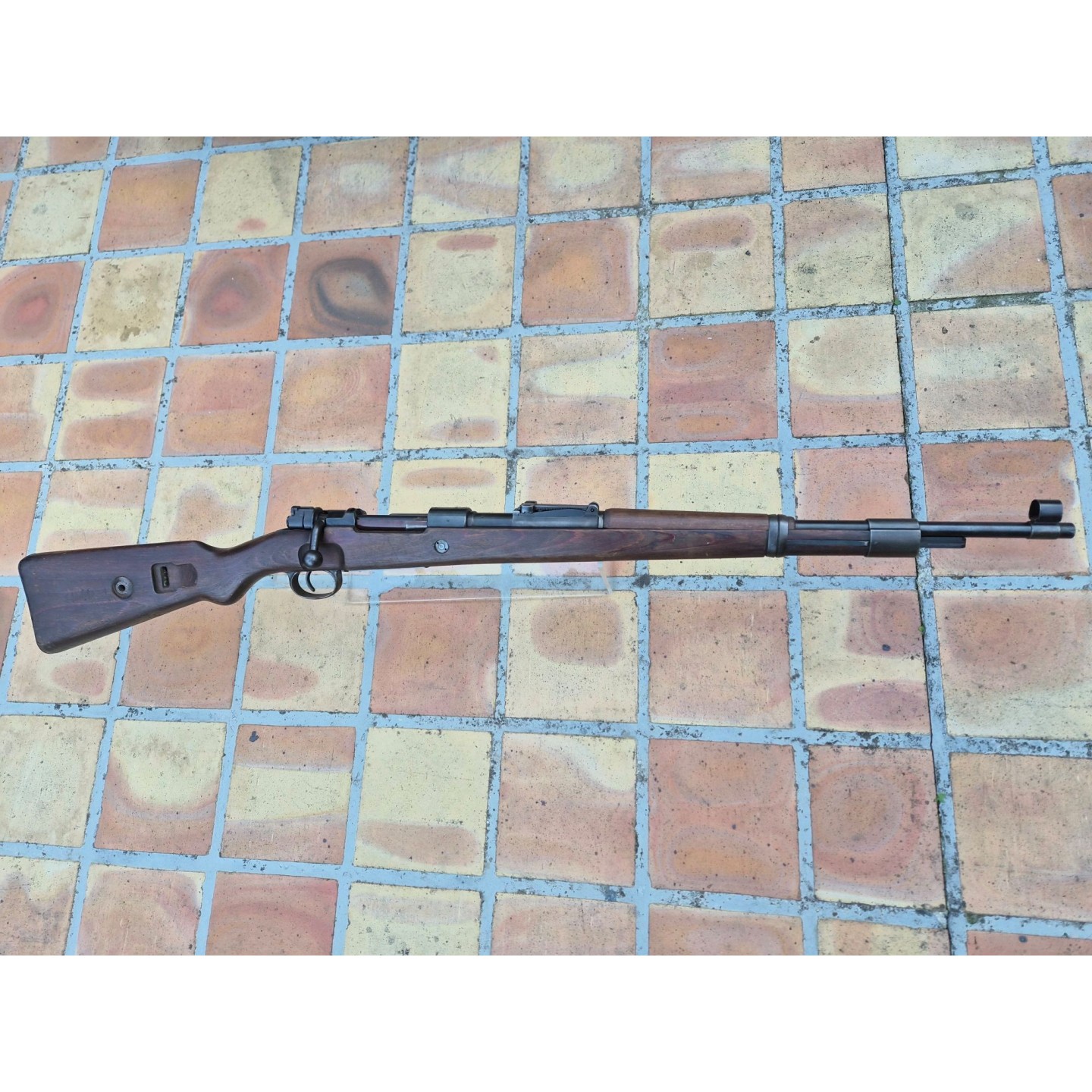 Carabine Mauser modèle K98K Mauser Werke Oberndorf en calibre d'origine 8x57JS, capacité 5 coups à répétition manuelle. Bronzage d'origine patiné. Mécanisme complet et fonctionnel avec toutes pièces d'origine, marquages et poinçon non atténués. Bon canon , rayures bien nettes, crosse et garde main en lamellé collé bien réceptionné avec traces de manipulation.