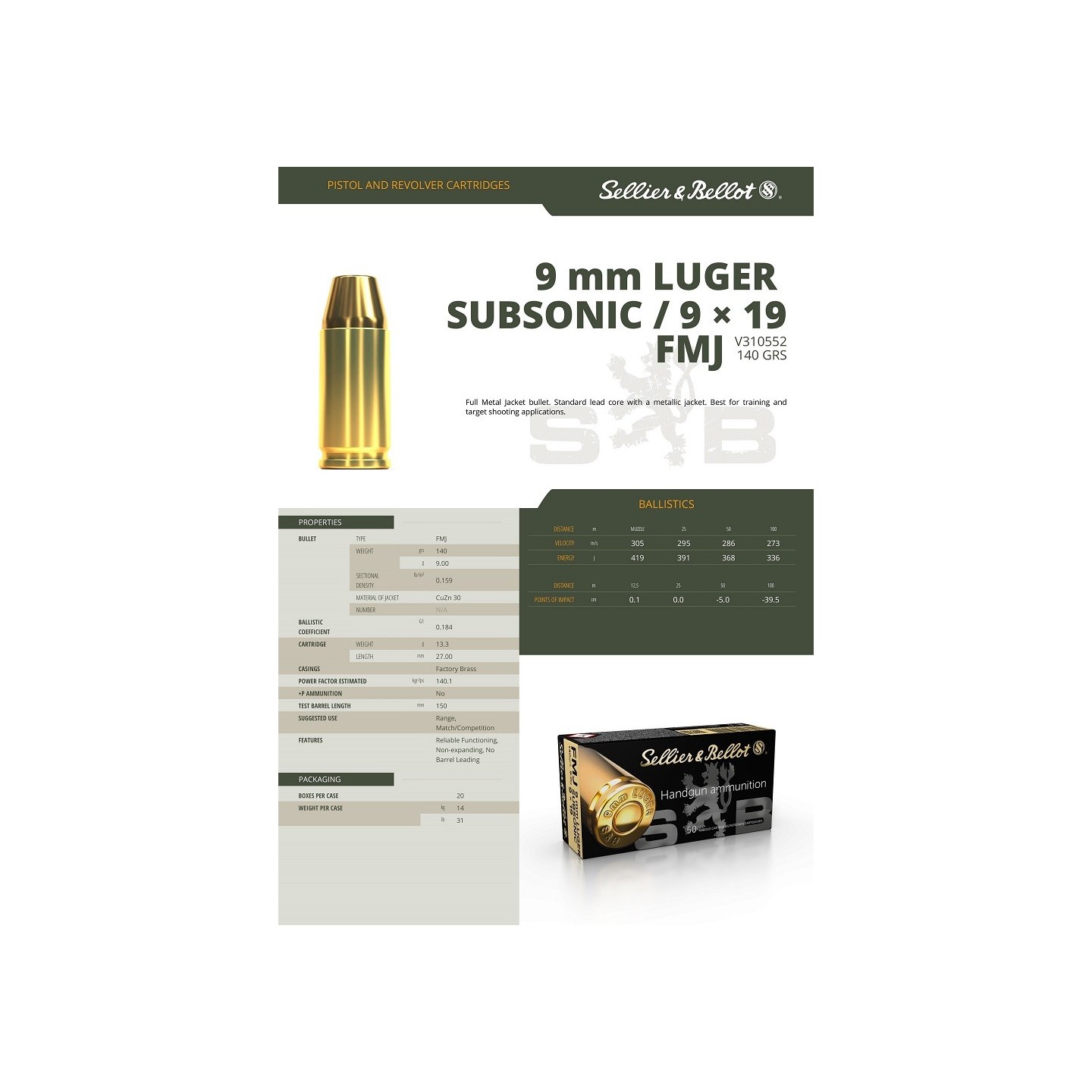 Balle Full Metal Jacket. Noyau de plomb standard avec une enveloppe métallique. Idéale pour l'entraînement et le tir sur cible.