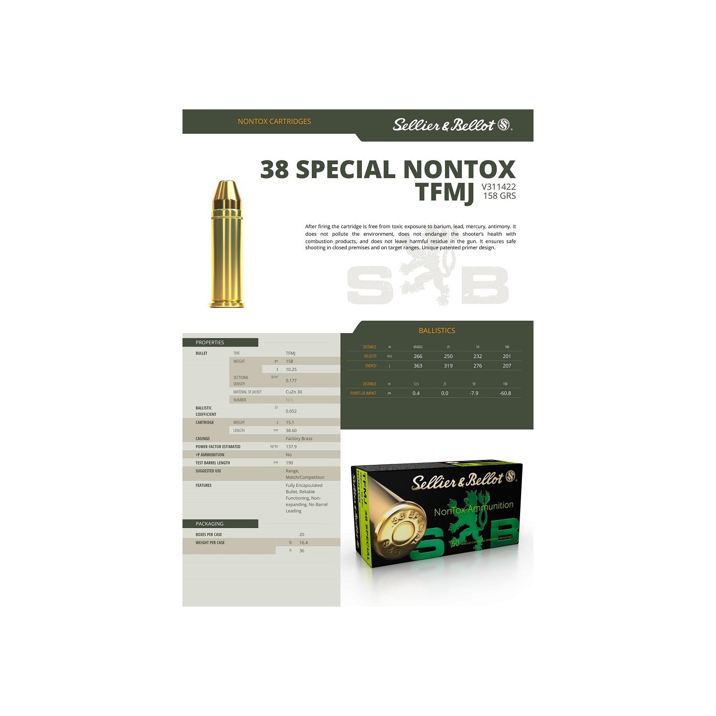 CARTOUCHES SELLIER BELLOT 38SP 158 GRS TFMJ NONTOX CAT B
